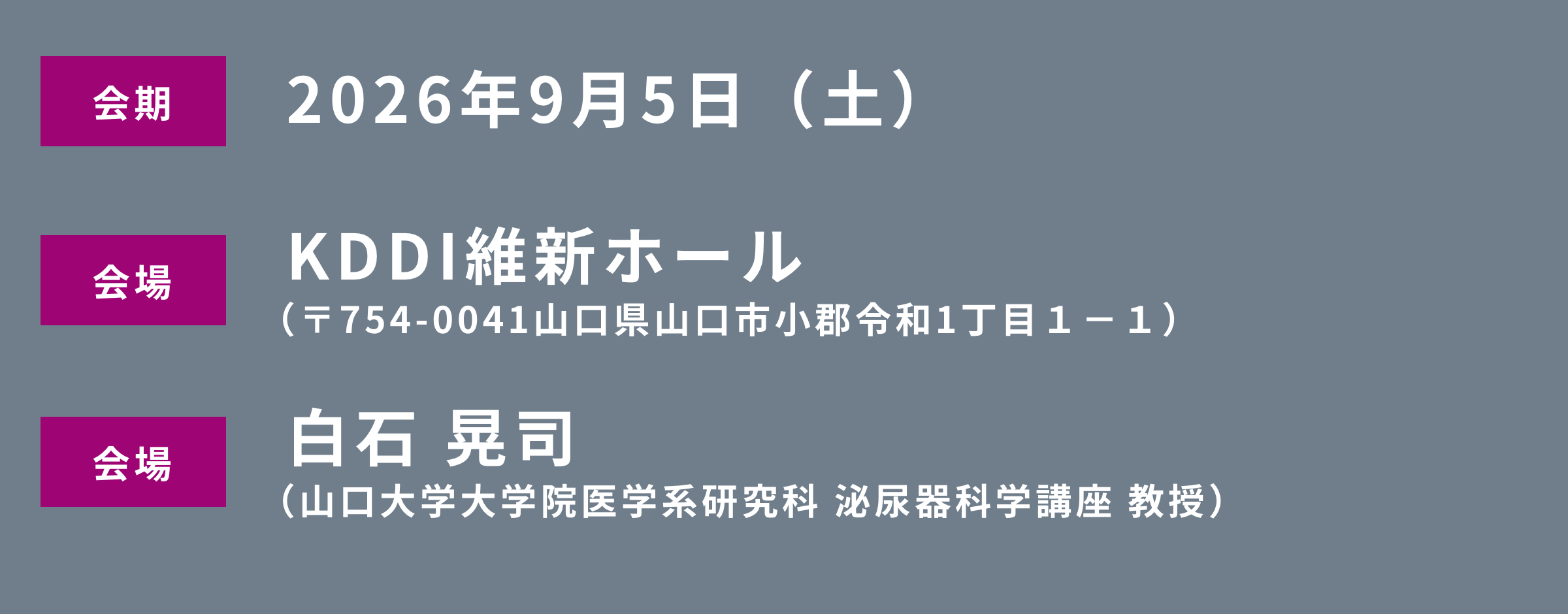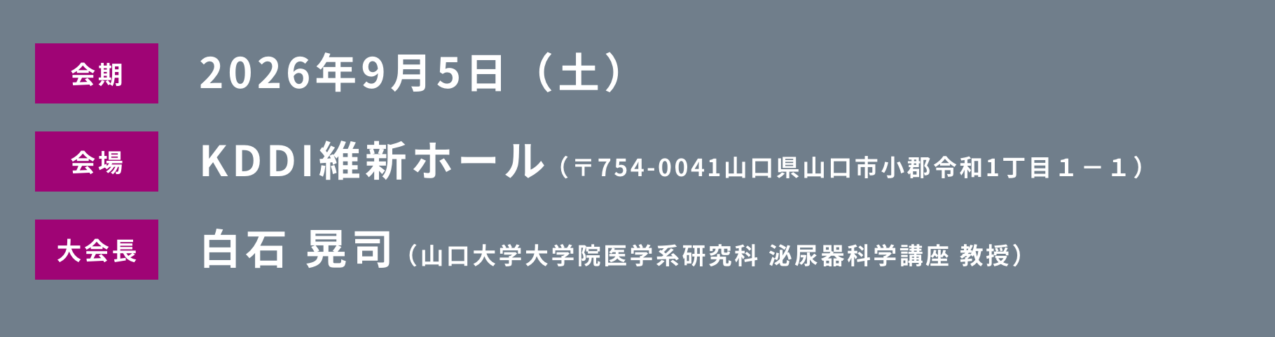 会場となるKDDI維新ホールは、新山口駅直結のアクセス至便な施設でございます。また、山口市は、2024年1月にニューヨーク・タイムズ紙が発表した「2024年に行くべき52カ所」において世界第3位に選出され、国内外から注目を集めております。「西の京都」とも称される山口市は、歴史ある街並みと落ち着いた佇まいを今に残しており、土曜日の午前中や、1泊されての日曜日などに、明治維新の息吹を存分に感じていただけることと存じます。